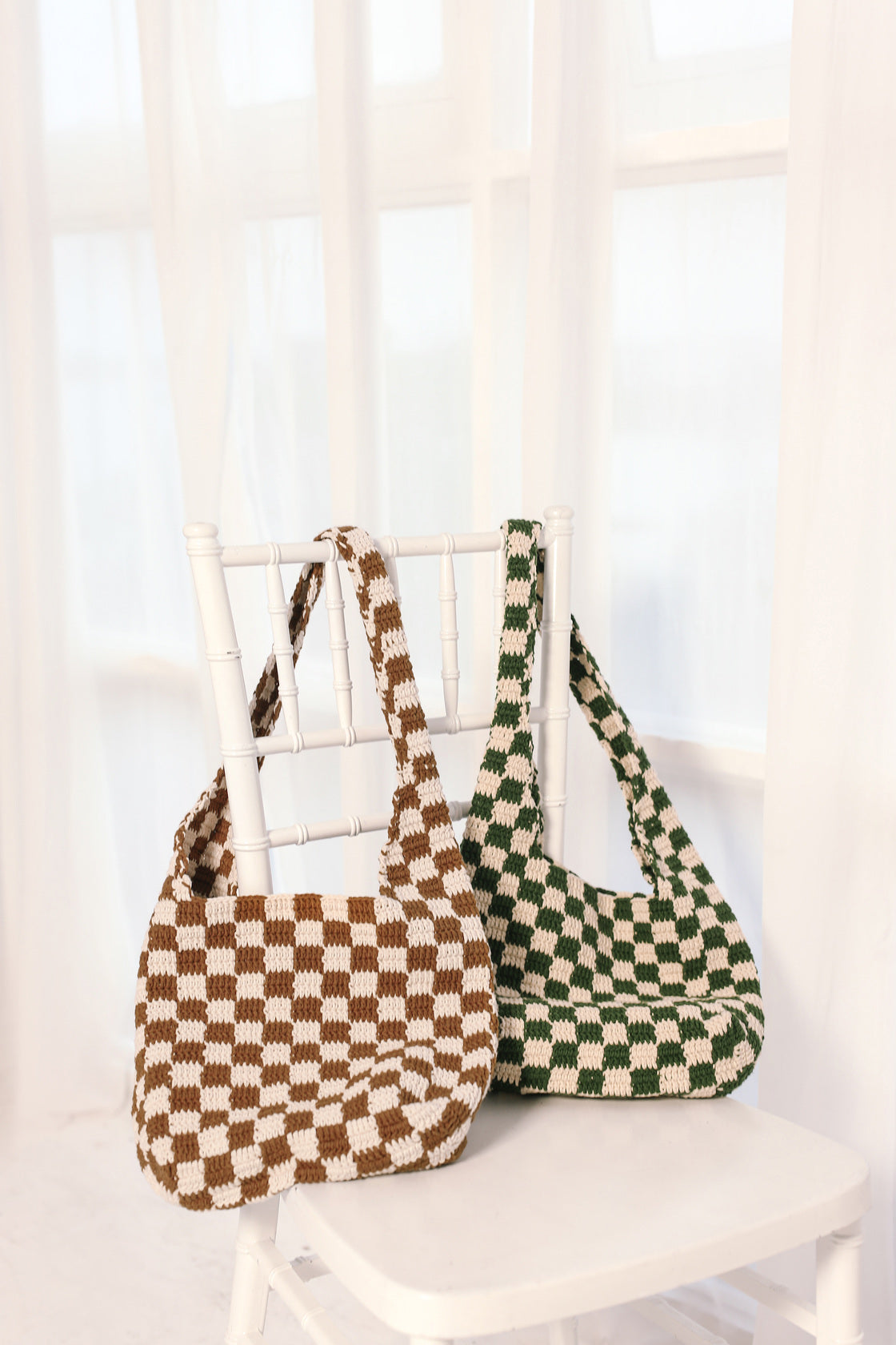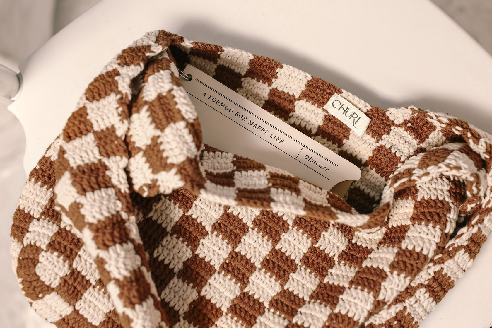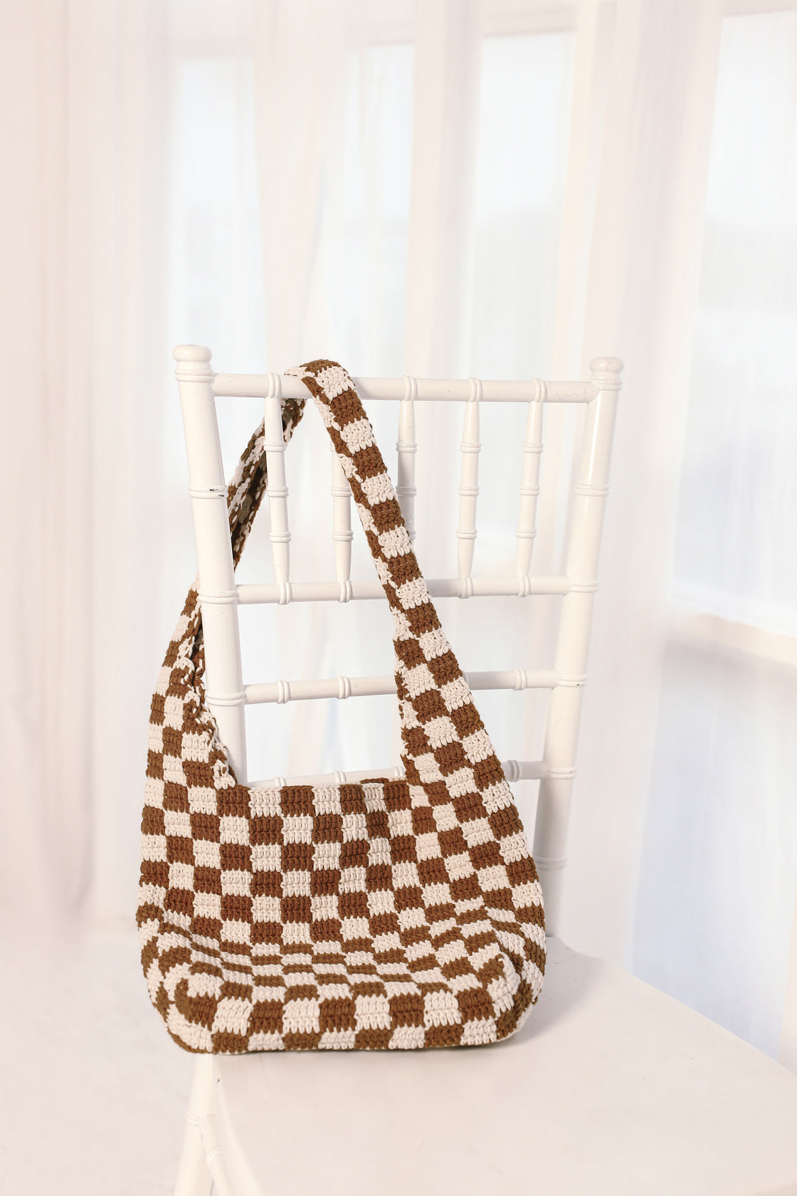 Brown Checkered Pattern Crochet Tote Bag