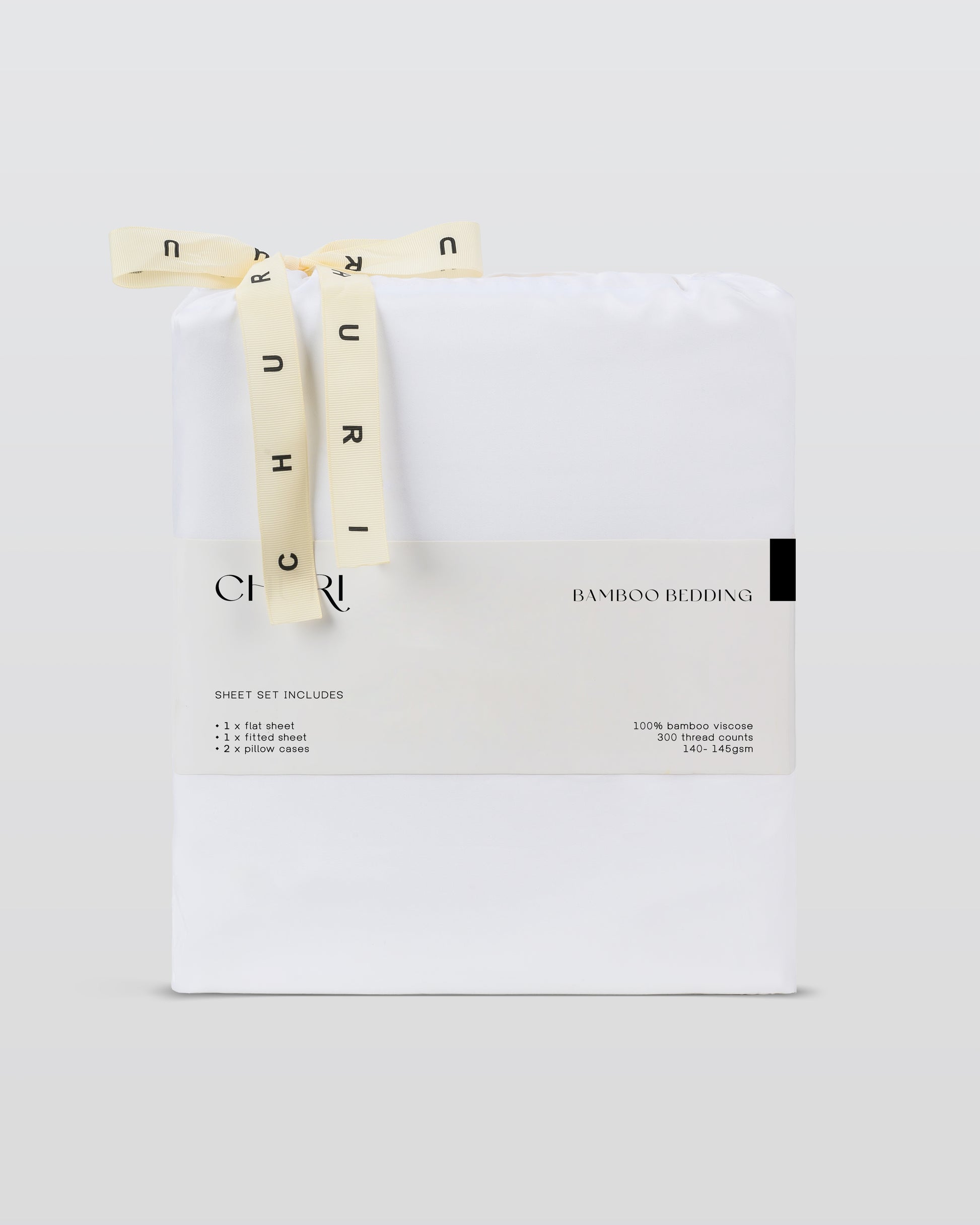- All About the Comfort – Churi signature bamboo bedding set includes 1 flat sheet, 1 fitted sheet and 2 envelope closure pillowcases, beautifully packaged with a matching dust bag for easy storage.