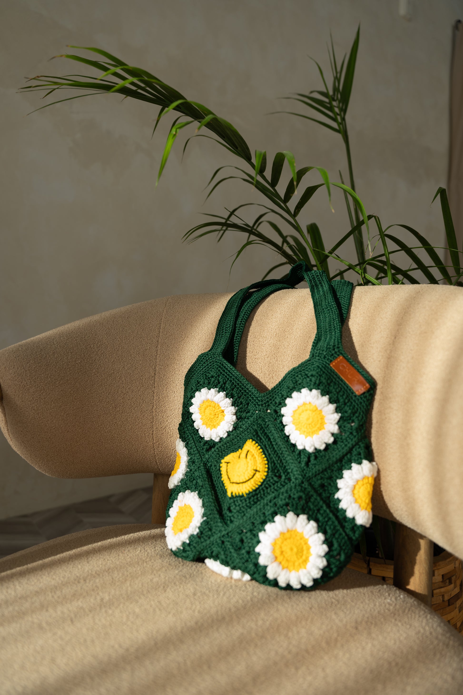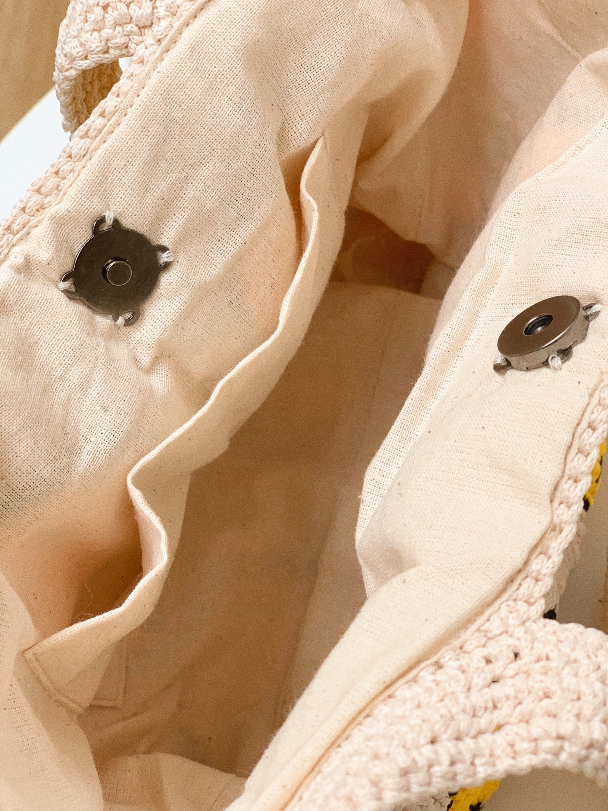 This adorable smiley face crochet bag is the perfect way to add a touch of fun and personality to your everyday look. Made with soft, high-quality yarn, this bag is both stylish and comfortable to wear. Our crochet bag has a magnet button, and multiple pockets inside for essentials and Hand crocheted with care