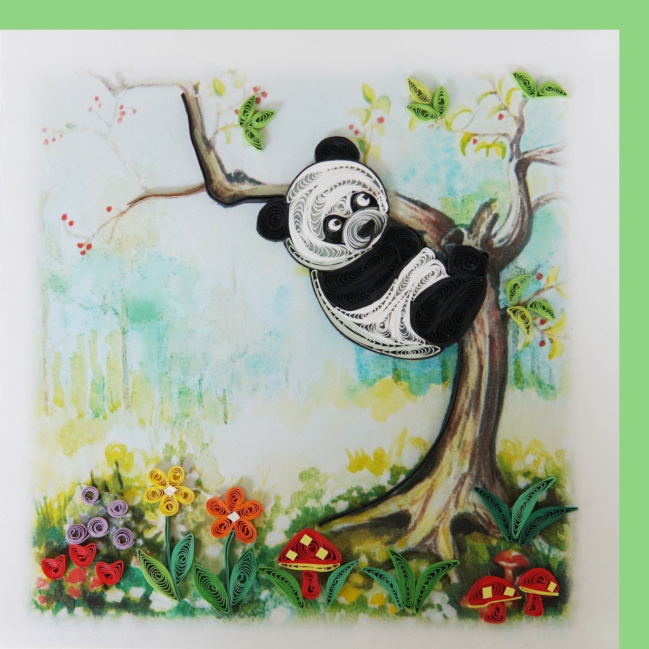 Panda Quilling Card, featuring a charming scene of a panda hanging from a tree branch.