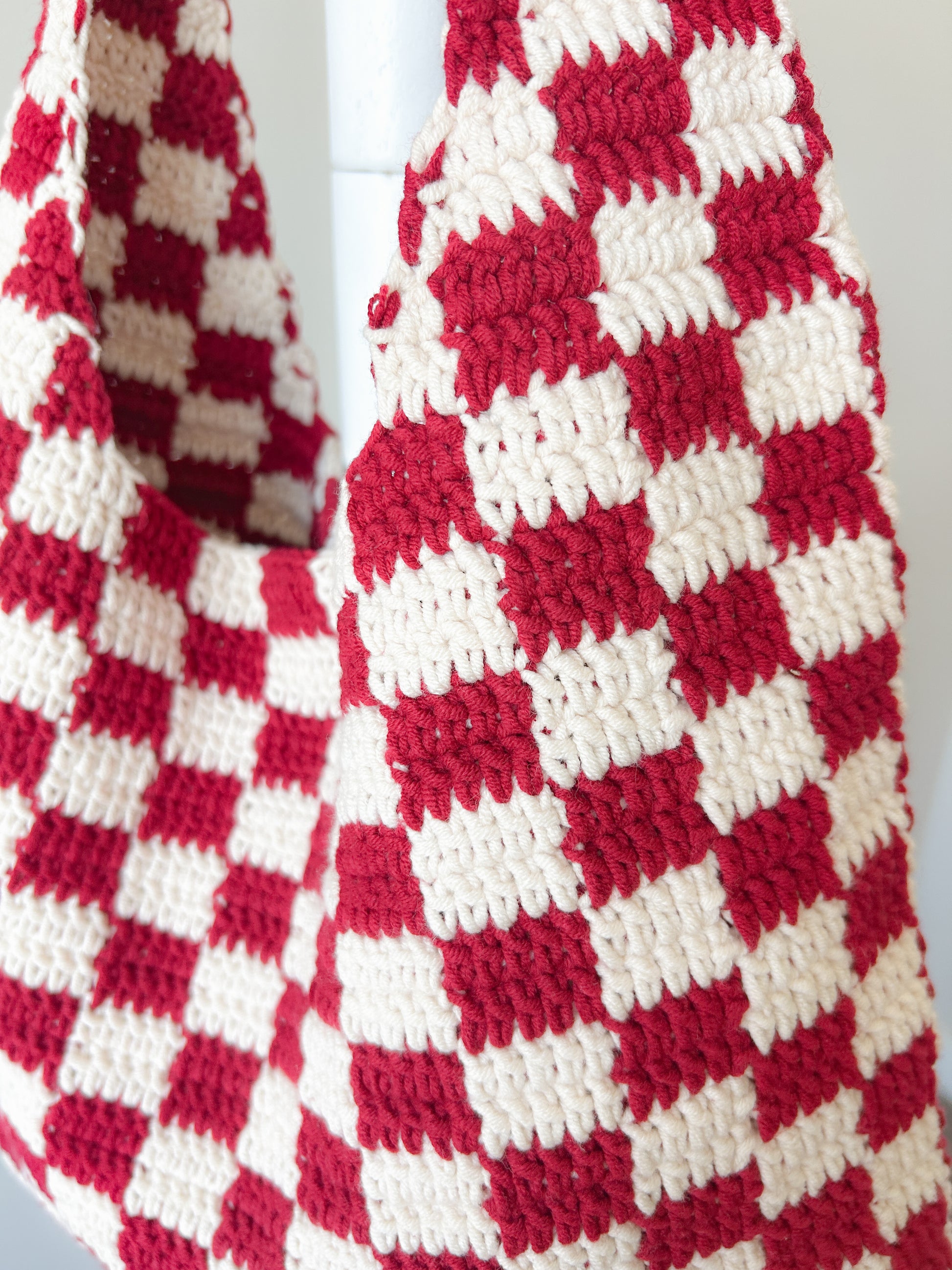 Red&Beige Checkered Crochet Tote Bag